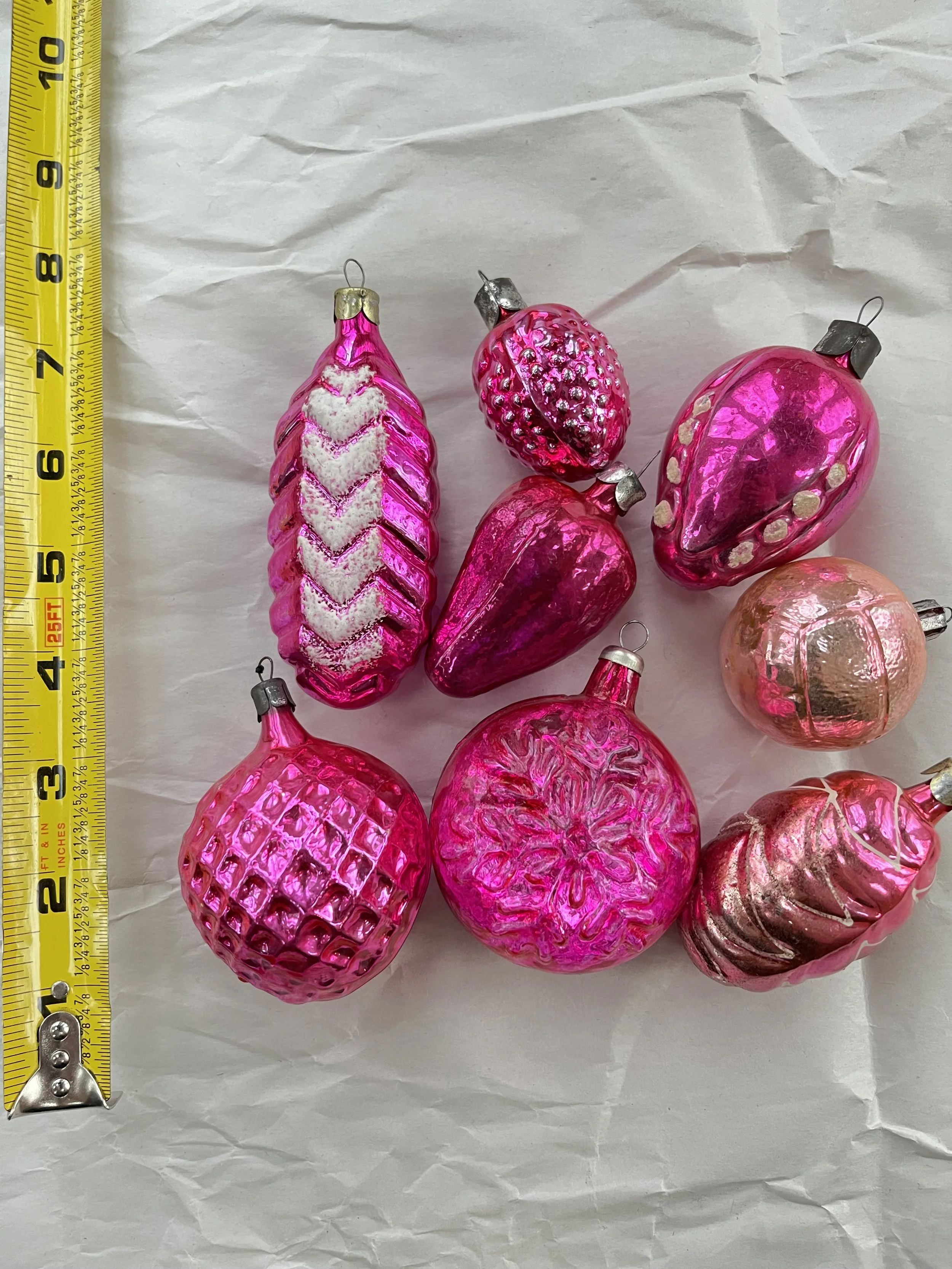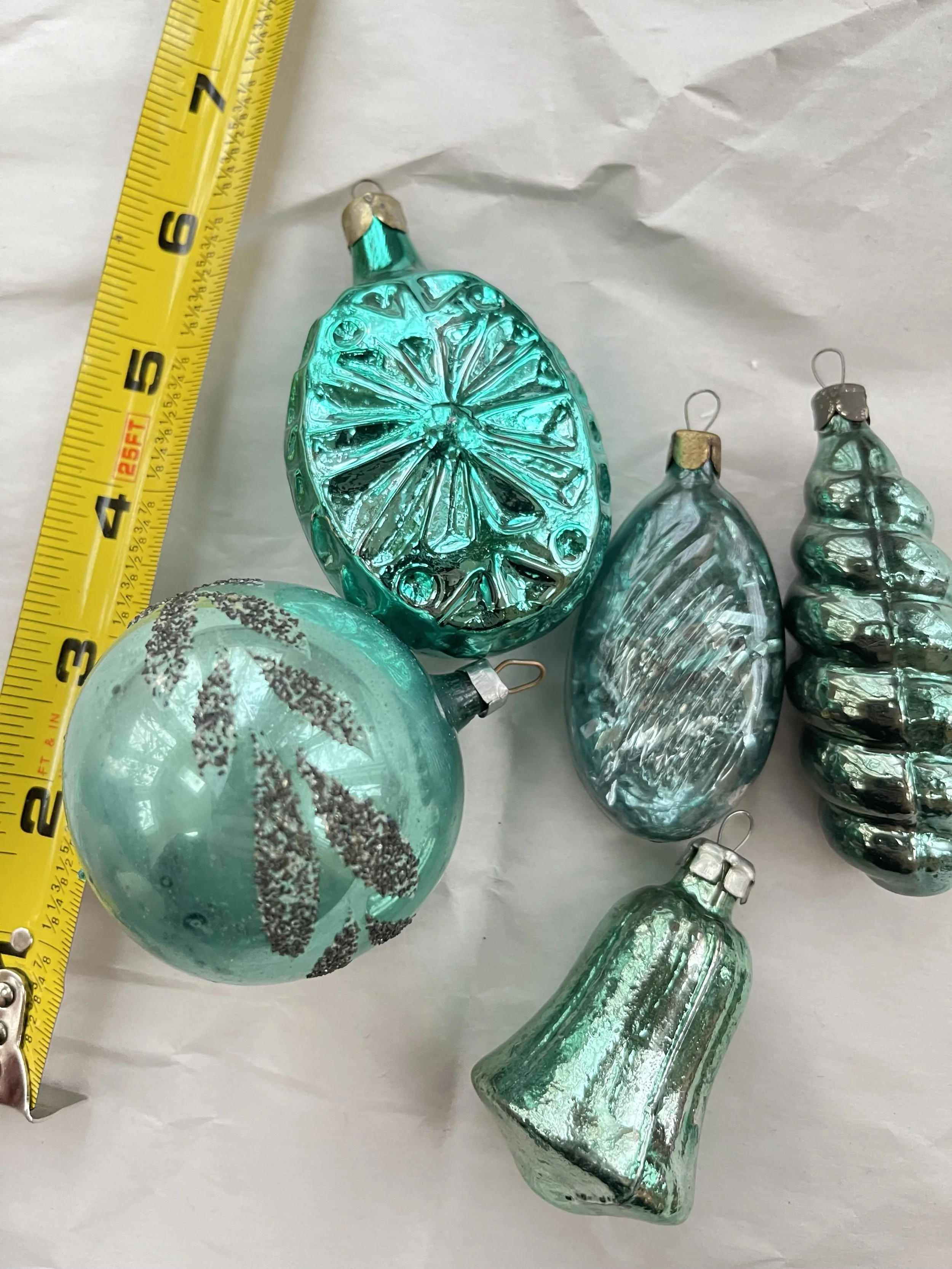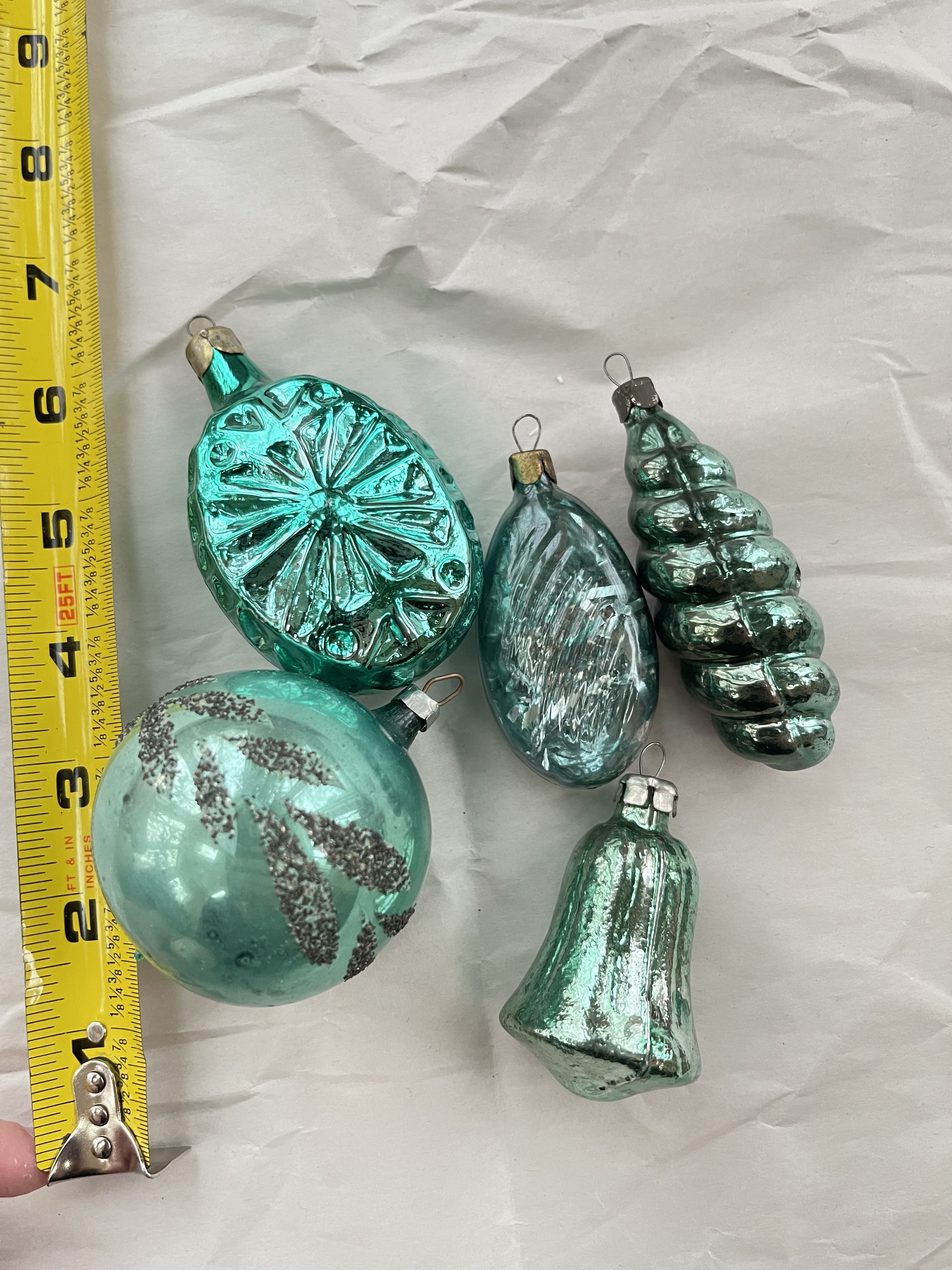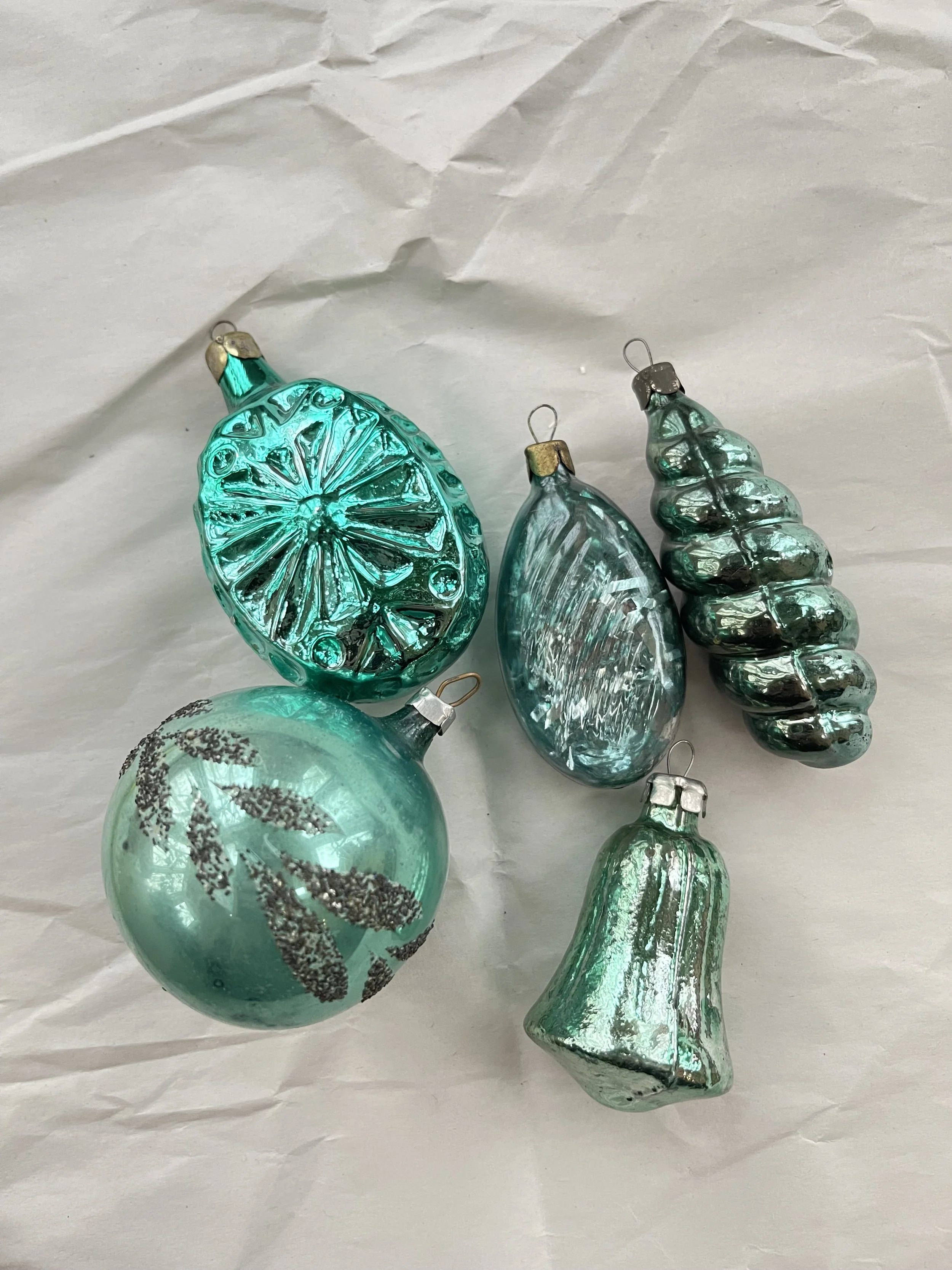 A striking set of ten vintage USSR ornaments in shimmering silver and aqua tones. Age wear to lacquer and caps but no cracks noted; they retain excellent color and display beautifully. A lovely set for collectors or anyone decorating with icy winter tones.