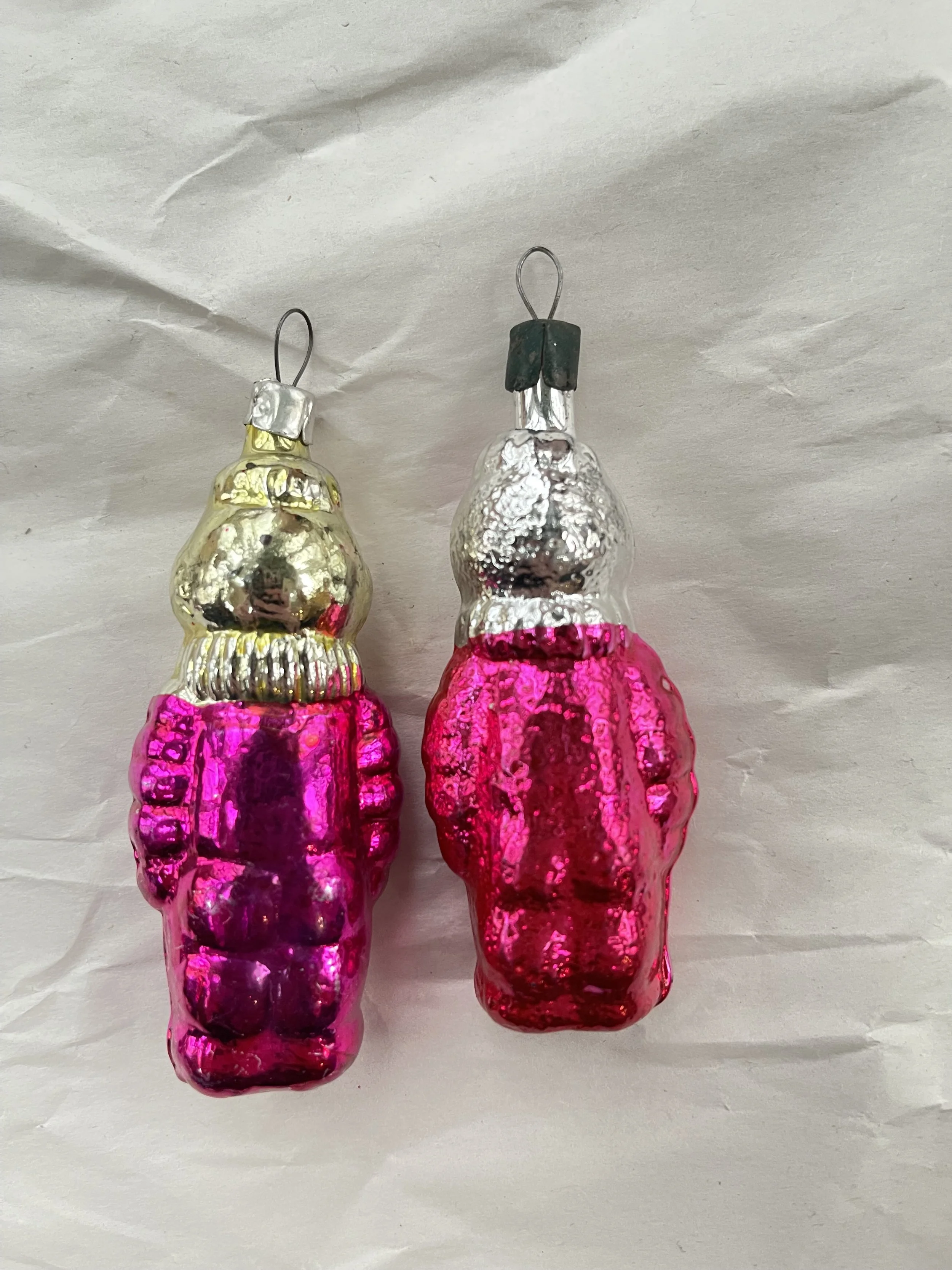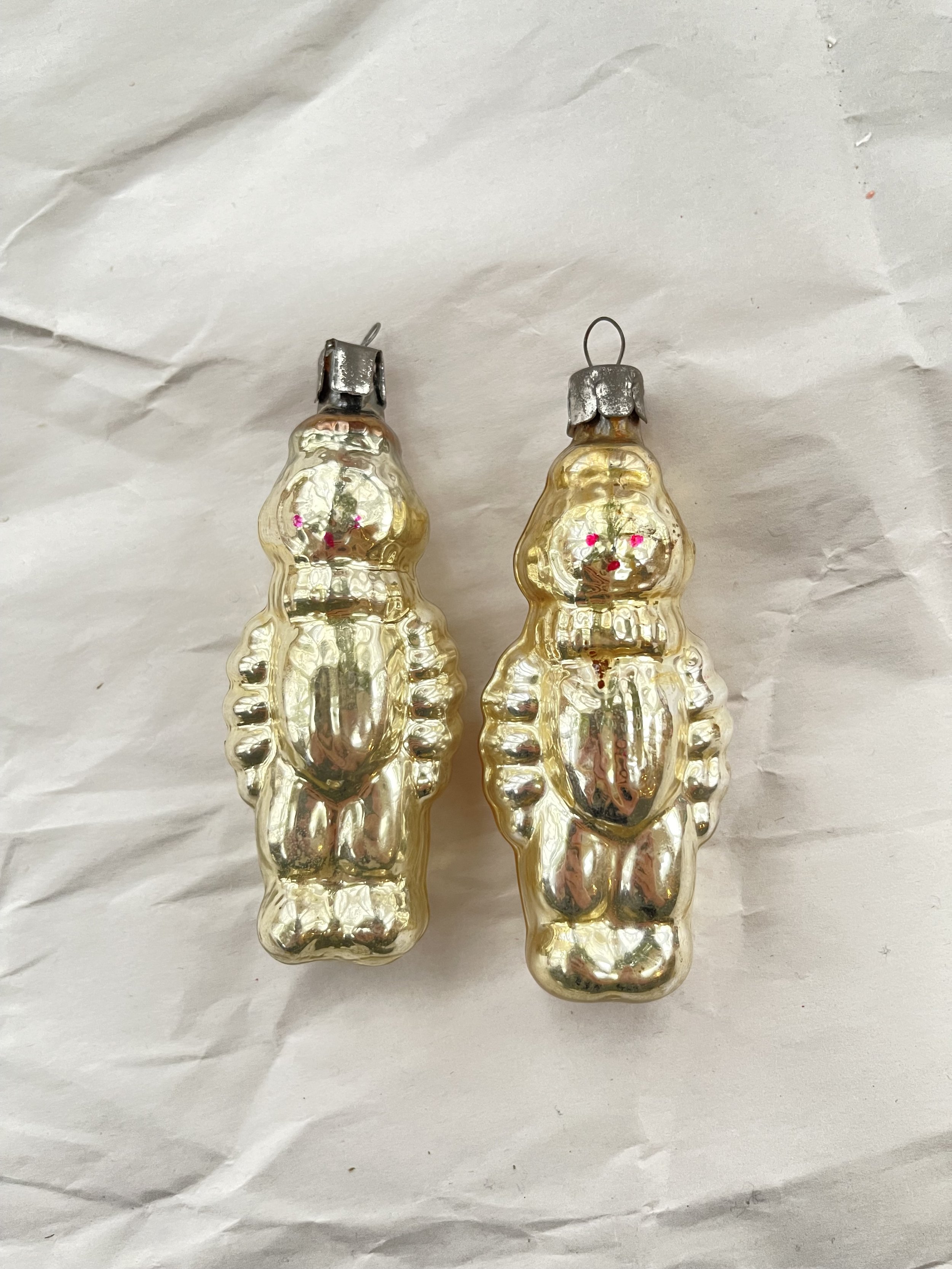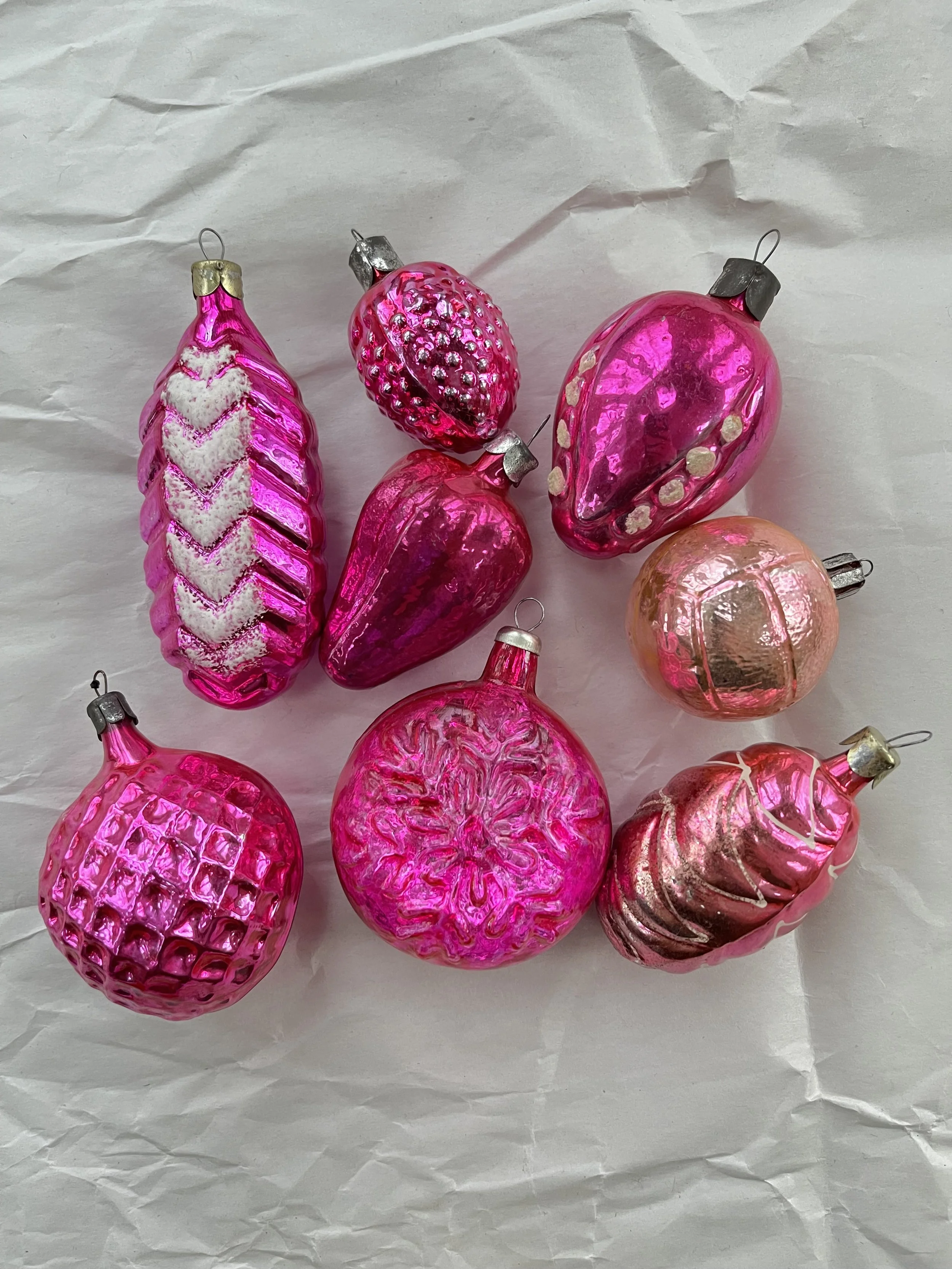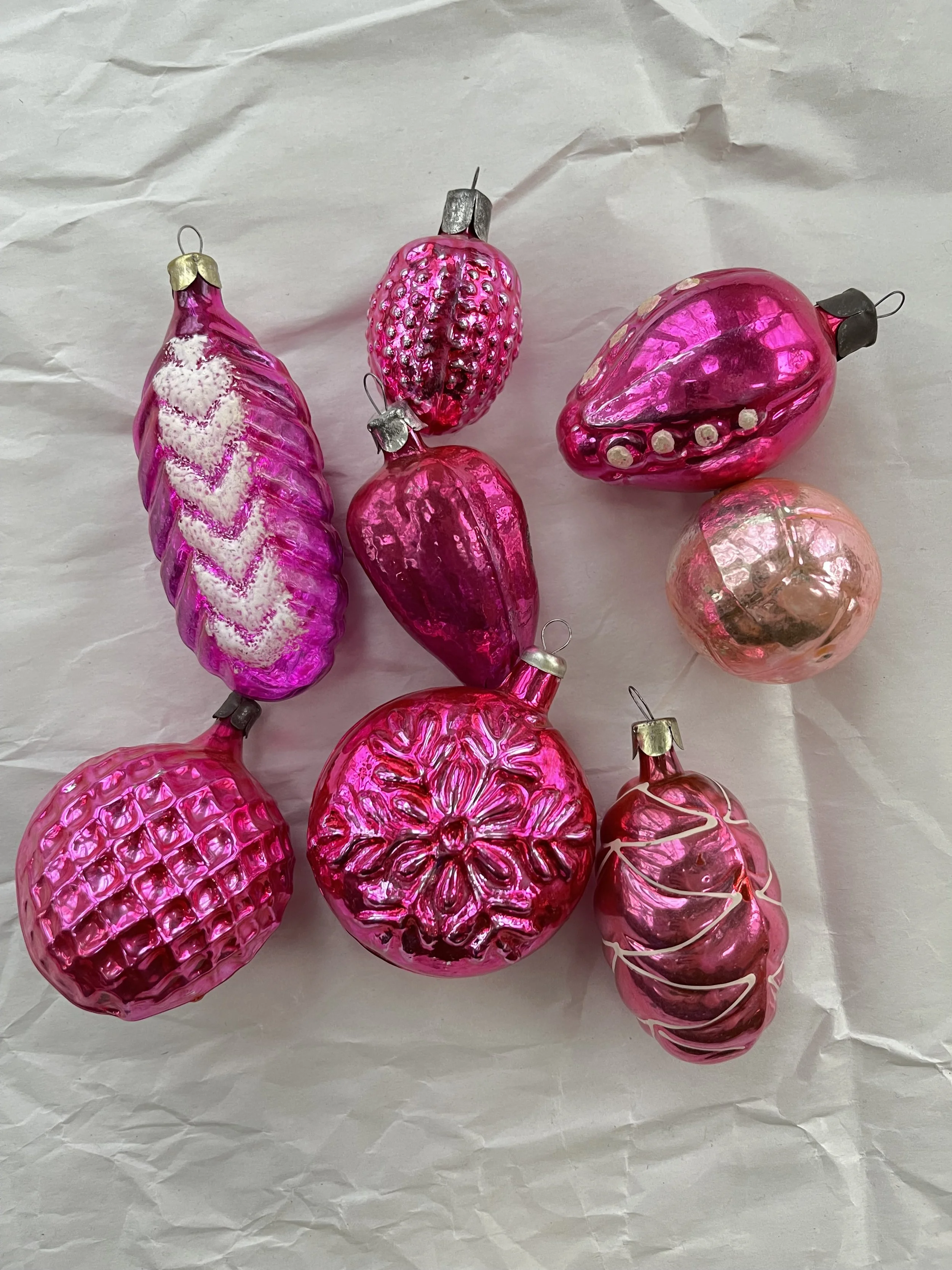 A striking set of ten vintage USSR ornaments in shimmering silver and aqua tones. Age wear to lacquer and caps but no cracks noted; they retain excellent color and display beautifully. A lovely set for collectors or anyone decorating with icy winter tones.